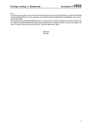 Thüringer Landtag - 4. Wahlperiode Drucksache 4/ 1053 Zu 7.: Es ist davon auszugehen, dass sich sowohl die Unternehmen als auch die Tarifpartner mit der Problematik "Arbeitszeitflexibilisierung" auch zugunsten der familiären Betreuungssituation beschäftigen. Dies wird je- doch nicht erfasst. Ein Ausdruck für Familienfreundlichkeit sind z. B. die Audits für Familie und Beruf und Total E-Quality und der Preis für Familienfreundlichkeit des Bundesministeriums für Familie, Senioren, Frauen und Jugend, die auch Thüringer Unternehmer erworben bzw. verliehen bekommen haben. Reinholz Minister 3