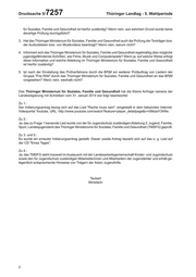 Drucksache 5/ 7257 Thüringer Landtag - 5. Wahlperiode für Soziales, Familie und Gesundheit ist hierfür zuständig? Wenn nein, aus welchem Grund wurde keine derartige Prüfung durchgeführt? 3. Hat das Thüringer Ministerium für Soziales, Familie und Gesundheit auch die Prüfung der Tonträger bzw. der Audiodateien bzw. von Musikvideos beantragt? Wenn nein, warum nicht? 4. Informiert sich das Thüringer Ministerium für Soziales, Familie und Gesundheit regelmäßig über mögliche jugendgefährdende Schriften, wie Filme, Musik und Computerspiele? Wenn ja, auf welche Weise erfolgt diese Information und welche Abteilung im Thüringer Ministerium für Soziales, Familie und Gesundheit ist hierfür zuständig? 5. Ist nach der Einstellung des Prüfverfahrens durch die BPjM ein weiterer Prüfauftrag von Liedern der Gruppe "Frei.Wild" durch das Thüringer Ministerium für Soziales, Familie und Gesundheit an das BPjM vorgesehen? Wenn nein, weshalb nicht? Das Thüringer Ministerium für Soziales, Familie und Gesundheit hat die Kleine Anfrage namens der Landesregierung mit Schreiben vom 31. Januar 2014 wie folgt beantwortet: Zu 1.: Der Initiierungsantrag bezog sich auf das Lied "Rache muss sein", eingestellt in dem bekannten Internet- Videoportal Youtube, URL: http://www.youtube.com/watch?feature=player_detailpage&v=i0MzaiY3Wfw. Zu 2.: Ja; das zu Frage 1 benannte Lied wurde von der für Jugendschutz zuständigen Abteilung 3, Jugend, Familie, Sport, Landesjugendamt des Thüringer Ministeriums für Soziales, Familie und Gesundheit (TMSFG) geprüft. Zu 3. und 5.: Es wurde ein erneuter Initiierungsantrag gestellt. Dieser zweite Antrag bezieht sich auf das o. g. Lied auf der CD "Eines Tages". Zu 4.: Ja; das TMSFG steht insoweit im Austausch mit der Landesarbeitsgemeinschaft Kinder- und Jugendschutz sowie den für Jugendschutz zuständigen Mitarbeiterinnen und Mitarbeitern der Jugendämter und erhält ge- legentlich entsprechende Hinweise von Trägern der freien Jugendhilfe. Taubert Ministerin 2