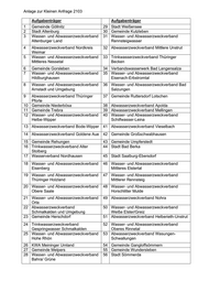 Anlage zur Kleinen Anfrage 2103 Aufgabenträger Aufgabenträger 1 Gemeinde Göllnitz 29 Stadt Weißensee 2 Stadt Altenburg 30 Gemeinde Kutzleben 3 Wasser- und Abwasserzweckverband 31 Wasser- und Abwasserzweckverband Altenburger Land Rennsteigwasser 4 Abwasserzweckverband Nordkreis 32 Abwasserzweckverband Mittlere Unstrut Weimar 5 Wasser- und Abwasserzweckverband 33 Trinkwasserzweckverband Thüringer Mittleres Nessetal Becken 6 Gemeinde Gorsleben 34 Verbandswasserwerk Bad Langensalza 7 Wasser- und Abwasserzweckverband 35 Wasser- und Abwasserzweckverband Hildburghausen Eisenach-Erbstromtal 8 Wasser- und Abwasserzweckverband 36 Wasser- und Abwasserzweckverband Bad Arnstadt und Umgebung Salzungen 9 Abwasserzweckverband Thüringer 37 Gemeinde Ruttersdorf Lotschen Pforte 10 Gemeinde Niederbösa 38 Abwasserzweckverband Apolda 11 Gemeinde Trebra 39 Abwasserzweckverband Mellingen 12 Wasser- und Abwasserzweckverband 40 Wasser- und Abwasserzweckverband Helbe-Wipper Schilfwasser-Leina 13 Abwasserzweckverband Bode-Wipper 41 Abwasserzweckverband Vieselbach 14 Abwasserzweckverband Goldene Aue 42 Gemeinde Großschwabhausen 15 Gemeinde Rehungen 43 Gemeinde Umpferstedt 16 Trinkwasserzweckverband Alter 44 Stadt Bad Berka Stolberg 17 Wasserverband Nordhausen 45 Stadt Saalburg-Ebersdorf 18 Wasser- und Abwasserzweckverband 46 Wasser- und Abwasserzweckverband Eisenberg Mittleres Elstertal 19 Wasser- und Abwasserzweckverband 47 Wasser- und Abwasserzweckverband Thüringer Holzland Mittlerer Rennsteig 20 Wasser- und Abwasserzweckverband 48 Wasser- und Abwasserzweckverband Obere Saale Horschlitter Mulde 21 Wasser- und Abwasserzweckverband 49 Abwasserzweckverband Nohra Orla 22 Abwasserzweckverband 50 Wasser- und Abwasserzweckverband Schmalkalden und Umgebung Weiße Elster/Greiz 23 Gemeinde Herschdorf 51 Abwasserzweckverband Helberieth-Unstrut 24 Trinkwasserzweckverband 52 Wasser- und Abwasserzweckverband Gespringwasser Schmalkalden Oberes Rinnetal 25 Wasser- und Abwasserzweckverband 53 Abwasserzweckverband Wasungen- Hohe Rhön Schwallungen 26 KWA Meininger Umland 54 Gemeinde Gangloffsömmern 27 Gemeinde Melpers 55 Gemeinde Wundersleben 28 Wasser- und Abwasserzweckverband 56 Stadt Sömmerda Bahra/ Grüne