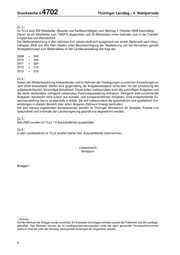 Drucksache 4/ 4702 Thüringer Landtag - 4. Wahlperiode Zu 3.: Im TLLV sind 332 Mitarbeiter (Beamte und Tarifbeschäftigte) zum Stichtag 1. Oktober 2008 beschäftigt. Davon ist ein Mitarbeiter zum TMSFG abgeordnet und 33 Mitarbeiter/-innen befinden sich in der Freistel- lungsphase von Altersteilzeit. Die Stellenentwicklung in den nächsten fünf Jahren stellt sich ausgehend von einem Stellensoll nach Haus- haltsplan 2008 von 354 Plan-/Stellen unter Berücksichtigung der Realisierung von kw-Vermerken gemäß Strategiekonzept zum Stellenabbau in der Landesverwaltung wie folgt dar: 2009 = 343 2010 = 336 2011 = 324 2012 = 319 2013 = 310 Zu 4.: Neben der Wiederbesetzung freiwerdender und im Rahmen der Festlegungen zu externen Einstellungen im Jahr 2009 besetzbarer Stellen wird gegenwärtig der Aufgabenbestand verbunden mit der Umsetzung der aufgabenkritischen Vorschläge aktualisiert. Diese sollen insbesondere auch die zukünftigen Aufgaben und die damit verbundene zwingend notwendige Personalausstattung enthalten. Zwingend wahrzunehmende Aufgaben resultieren nicht zuletzt aus bundes- und europarechtlichen Vorgaben. Eine entsprechende Zu- sammenstellung hierzu ist ebenfalls in Arbeit. Sie soll insbesondere die quantitativen und qualitativen Ent- wicklungen in diesem Bereich über einen längeren Zeitraum hinweg beinhalten. Die sich hieraus ergebenden Konsequenzen werden im Thüringer Ministerium für Soziales, Familie und Gesundheit und innerhalb der Landesregierung geprüft und abgestimmt werden. Zu 5.: Seit 2005 wurden im TLLV 13 Auszubildende ausgebildet. Zu 6.: In den Landesdienst im TLLV wurden bisher fünf Auszubildende übernommen. Lieberknecht Ministerin Anlagen*) *) Hinweis: Auf den Abdruck der Anlagen wurde verzichtet. Ein Exemplar mit Anlagen erhielten jeweils die Fraktionen und die Landtags- bibliothek. Des Weiteren können sie im Landtagsinformationssystem unter der oben genannten Drucksachennummer sowie im Internet unter der Adresse: www.parldok.thueringen.de eingesehen werden. 6