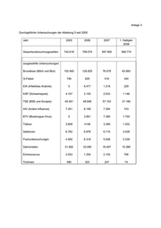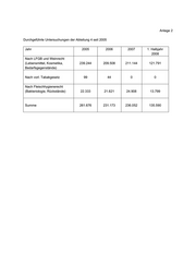 Anlage 2 Durchgeführte Untersuchungen der Abteilung 4 seit 2005 Jahr 2005 2006 2007 1. Halbjahr 2008 Nach LFGB und Weinrecht (Lebensmittel, Kosmetika, 239.244 209.508 211.144 121.791 Bedarfsgegenstände) Nach vorl. Tabakgesetz 99 44 0 0 Nach Fleischhygienerecht (Bakteriologie, Rückstände) 22.333 21.621 24.908 13.799 Summe 261.676 231.173 236.052 135.590