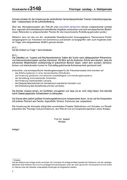 Drucksache 4/ 3148 Thüringer Landtag - 4. Wahlperiode Schulen erhalten für die Umsetzung der verbindlichen fächerübergreifenden Themen Unterstützungsange- bote - insbesondere für die Lehrerfortbildung. Über das Informationssystem des ThILLM unter www.thillm.de/tisonline können entsprechende zentrale bzw. regionale (Schulamtsbereiche betreffende) Angebote recherchiert und nach schulspezifischen Bedürf- nissen Referenten zu entsprechenden Themen für die innerschulische Fortbildung gefunden werden. Weiterhin kann auf das von der Landesstelle Gewaltprävention herausgegebene "Gemeinsame Fortbil- dungsprogramm zur Prävention von Extremismus und Gewalt" zurückgegriffen oder auch Angebote ande- rer Träger (wie beispielsweise MOBIT) genutzt werden. Zu 2.: Auf die Antwort zu Frage 1 wird verwiesen. Zu 3.: Die Debatten um "Jugend und Rechtsextremismus" haben die Suche nach pädagogischen Präventions- und Interventionskonzepten spürbar intensiviert. Mit Blick auf die Institution Schule wird deutlich, dass die schulischen Möglichkeiten vordergründig im präventiven Bereich liegen, indem dem sozialen, demokra- tischen und interkulturellen Lernen im Schulalltag gebührende Aufmerksamkeit geschenkt wird. Unterrichts- und schulspezifische Handlungskonzepte für die Präventionsarbeit sind orientiert auf - das Erfahrungslernen in einer demokratischen Schulkultur, - die Förderung politischer und ethischer Urteilsfähigkeit und Handlungskompetenz, - die Vermittlung immunisierender Einsichten, - die Förderung interkulturellen Lernens, - die Gesprächsbereitschaft mit rechtsextrem-orientierten Schülern und - die Entwicklung des Sozialklimas und der Lernkultur. Die Schüler müssen lernen, mit Konflikten umzugehen und dass sie es nicht nötig haben, ihre Identität durch Gewalt gegenüber Schwächeren zu behaupten. Da Schule allein jedoch größere Erziehungsdefizite kaum kompensieren kann, ist sie auf die Kooperation mit anderen Partnern wie Familie, Jugendhilfe, Vereine, Kommune usw. angewiesen. Die Umsetzung der Konzepte erfolgt über verschiedene Projekte, Maßnahmen und Vorhaben zur Gewalt- prävention des Thüringer Kultusministeriums, des ThILLM und von Kooperationspartnern (siehe Anlage). Prof. Dr. Goebel Minister Anlage*) *) Hinweis: Auf den Abdruck der Anlage wurde verzichtet. Ein Exemplar mit Anlage erhielten jeweils die Fraktionen und die Landtags- bibliothek. Des Weiteren kann sie im Landtagsinformationssystem unter der oben genannten Drucksachennummer sowie im Internet unter der Adresse: www.parldok.thueringen.de eingesehen werden. 2