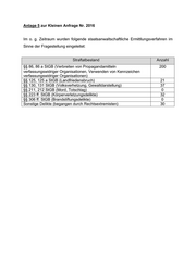 Anlage 5 zur Kleinen Anfrage Nr. 2016 Im o. g. Zeitraum wurden folgende staatsanwaltschaftliche Ermittlungsverfahren im Sinne der Fragestellung eingeleitet: Straftatbestand Anzahl §§ 86, 86 a StGB (Verbreiten von Propagandamitteln 200 verfassungswidriger Organisationen, Verwenden von Kennzeichen verfassungswidriger Organisationen) §§ 125, 125 a StGB (Landfriedensbruch) 21 §§ 130, 131 StGB (Volksverhetzung, Gewaltdarstellung) 37 §§ 211, 212 StGB (Mord, Totschlag) 0 §§ 223 ff. StGB (Körperverletzungsdelikte) 32 §§ 306 ff. StGB (Brandstiftungsdelikte) 0 Sonstige Delikte (begangen durch Rechtsextremisten) 30