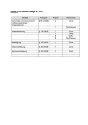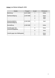 Anlage 2 zur Kleinen Anfrage Nr. 2016 Straftat Paragraf Anzahl PD-Bereich Verwenden von Kennzeichen § 86 a StGB 2 Jena verfassungswidriger Organisationen 1 Nordhausen Volksverhetzung § 130 StGB 3 Erfurt 1 Gera 5 Gotha 2 Nordhausen Beleidigung § 185 StGB 1 Erfurt Körperverletzung § 223 StGB 1 Jena Sachbeschädigung § 303 StGB 3 Suhl