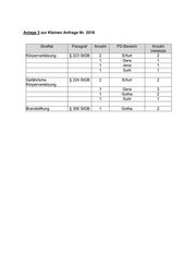 Anlage 3 zur Kleinen Anfrage Nr. 2016 Straftat Paragraf Anzahl PD-Bereich Anzahl Verletzte Körperverletzung § 223 StGB 2 Erfurt 2 1 Gera 1 1 Jena 1 1 Suhl 1 Gefährliche § 224 StGB 2 Erfurt 2 Körperverletzung 1 Gera 3 1 Gotha 2 1 Suhl 1 Brandstiftung § 306 StGB 1 Gotha 2
