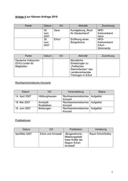 THÜRINGERLandtag Thüringer LANDTAG - 4. Wahlperiode Drucksache 4/ 3256 4. Wahlperiode 10.08.2007 Kleine Anfrage der Abgeordneten Berninger (Die Linkspartei.PDS) und Antwort des Thüringer Innenministeriums Rassistische und rechtsextremistische Aktivitäten in den Monaten April bis Juni 2007 Die Kleine Anfrage 2016 vom 29. Juni 2007 hat folgenden Wortlaut: In den Monaten April bis Juni 2007 setzten sich rassistische und rechtsextremistische Aktivitäten und Aus- schreitungen fort. Ich frage die Landesregierung: 1. Welche Aktivitäten (Veranstaltungen, Demonstrationen, Zusammenrottungen, Überfälle, Anschläge usw.) rechtsextremistischer und rassistischer Gruppen sind der Landesregierung in den Monaten April bis Juni 2007 bekannt geworden (bitte genaue Auflistung nach Ort, ggf. PD-Bereich, Datum, Aktivität bzw. Kon- text der Aktivität und ggf. Art der Straftaten)? 2. Welche Aktivitäten (Demonstrationen, Zusammenrottungen, Überfälle, Anschläge etc.) gegen Auslände- rinnen und Ausländer in Thüringen sind der Landesregierung in den Monaten April bis Juni 2007 bekannt geworden (bitte Auflistung nach Ort, ggf. PD-Bereich, Datum, Aktivität bzw. Kontext der Aktivität, ggf. Art der Straftat und ggf. Organisationszugehörigkeit des Täters bzw. der Täterin)? 3. Wie viele Personen wurden in den Monaten April bis Juni 2007 durch rechtsextremistische und rassisti- sche Anschläge und Überfälle verletzt oder getötet (mit der Bitte um genaue Auflistung nach Ort, ggf. PD-Bereich und Datum)? 4. Welche rassistischen oder rechtsextremistischen Parteien, Organisationen, Gruppen, Bands, Publikati- onen und Verlage gab es in den Monaten April bis Juni 2007 in Thüringen und wie sind sie jeweils konkret in Erscheinung getreten (bitte genaue Auflistung nach Organisation bzw. Publikation, Verlag oder Band, Mitgliederstärke bzw. Auflage, Aktivität, Datum und Ort, ggf. PD-Bereich)? 5. Wie viele Ermittlungs- bzw. Gerichtsverfahren wurden in den Monaten April bis Juni 2007 gegen Tatver- dächtige bzw. Täter und Täterinnen mit einem rassistischen oder rechtsextremistischen Hintergrund eingeleitet bzw. abgeschlossen (bitte genaue Auflistung nach Tatvorwurf bzw. Tat, Ort, ggf. PD-Bereich, ggf. Strafmaß und ggf. Organisationszugehörigkeit des Täters bzw. der Täterin)? 6. Wie viele Nachmeldungen rassistischer und rechtsextremer Straftaten wurden für das erste Quartal 2007 registriert? Druck: Thüringer Landtag, 15. August 2007 1