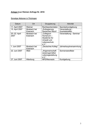 Anlage 4 zur Kleinen Anfrage Nr. 2016 Sonstige Aktionen in Thüringen Datum Ort Gruppierung Aktivität 11. April 2007 Weimar Rechtsextremisten Spontankundgebung 15. April 2007 Mosbach bei „Exilregierung Veranstaltung - Eisenach Deutsches Reich“ Quartalstreffen 20.-22. April Mosbach bei „Collegium Veranstaltung - Seminar 2007 Eisenach Humanum – Akademie für Umwelt und Lebensschutz e.V.“ 1. Juni 2007 Mosbach bei „Deutsches Kolleg“ Jahreshauptversammlung Eisenach 22. Juni 2007 Ilfeld „Artgemeinschaft Sonnenwendfeier wesensgemäßer Lebensgestaltung e.V.“ 27. Juni 2007 Altenburg NPD/Neonazis Kundgebung 3