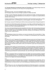 Thüringer Landtag 5. Wahlperiode Drucksache 5/ 5791 28.02.2013 Kleine Anfrage des Abgeordneten Korschewsky (DIE LINKE) und Antwort des Thüringer Ministeriums für Wirtschaft, Arbeit und Technologie Bilanz des Tourismusjahres 2012/Ausblick auf das Tourismusjahr 2013 Die Kleine Anfrage 2815 vom 15. Januar 2013 hat folgenden Wortlaut: Im Rahmen einer Pressekonferenz am 11. Januar 2013 stellte der Thüringer Wirtschaftsminister Matthias Machnig fest, dass der Tourismus in Thüringen im letzten Jahr gut vorangekommen ist, was sich insbeson- dere in der Steigerung der Gästeankünfte und Übernachtungen in den Thüringer Kur- und Erholungsorten zeigt. Des Weiteren gab der Minister einen Ausblick auf das Tourismusjahr 2013. Ich frage die Landesregierung: 1. In welchen Kur- und Erholungsorten Thüringens sind im vergangenen Jahr die Gäste- und Übernach- tungszahlen gestiegen, gleichbleibend oder gesunken (bitte Darstellung getrennt nach Städtetourismus, Kur- und Erholungsorten)? 2. Wie stellt sich die Verweildauer der Gäste Thüringens im Jahr 2012 dar und welche Entwicklung ist gegenüber dem Vorjahr zu verzeichnen? 3. Durch welchen Träger sollen die durch das Kompetenzzentrum der Thüringer Tourismus GmbH (TTG) angekündigten 20 Prüfer für Barrierefreiheit ausgebildet werden, nach welchen Kriterien werden die Prüfer ausgewählt und wie werden die Kompetenzen dieser Prüfer ermittelt und bescheinigt (Zertifikate)? 4. Handelt es sich bei den auszubildenden Prüfern für Barrierefreiheit um haupt- oder ehrenamtlich Be- schäftigte? Bei welchen Unternehmen sind diese angestellt? 5. Sollen Vertreter von Sozialverbänden und -vereinen in die Prüfungen der Barrierefreiheit einbezogen werden? Wenn ja, in welcher Weise? 6. Welche Kriterien werden zur Überprüfung der Barrierefreiheit in Ansatz gebracht, und mit welchen Kon- sequenzen hat ein Leistungsträger zu rechnen, falls er diese Kriterien nicht erfüllt? 7. Welche Stellung nimmt künftig das Kompetenzzentrum der TTG hinsichtlich der Qualitätssicherung aller Thüringer Gastgeber ein? 8. Welche Mindest-Qualitätskriterien wurden entwickelt, die als Grundlage für die anberaumten Qualitäts- überprüfungen und die anschließende Einordnung der Gastgeber Thüringens dienen sollen? 9. Wie und durch wen erfolgt die Auswertung der Qualitätsüberprüfungen und mit welchen Konsequenzen haben geprüfte Unternehmen zu rechnen, welche die vorgegebenen Qualitätsstandards nicht erfüllen? Druck: Thüringer Landtag, 7. März 2013