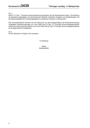 Drucksache 5/ 3430 Thüringer Landtag - 5. Wahlperiode Zu 2.: Nach § 117 Abs. 1 Thüringer Kommunalordnung beschränkt sich die Rechtsaufsicht darauf, "die Erfüllung der gesetzlich festgelegten und übernommenen öffentlich-rechtlichen Aufgaben und Verpflichtungen und die Gesetzmäßigkeit der Verwaltungstätigkeit im staatlichen Interesse zu überwachen". Das rechtsaufsichtliche Verfahren für die Prüfung der von den Aufgabenträgern der Abwasserentsorgung vorgelegten Gebührensatzungen ist in den Fällen des § 2 Abs. 4 a Thüringer Kommunalabgabengesetz konkret als Genehmigungsverfahren und in den Fällen des § 2 Abs. 5 Thüringer Kommunalabgabengesetz als Anzeigeverfahren ausgestaltet. Zu 3.: Auf die Übersicht in Anlage 2 wird verwiesen. In Vertretung Rieder Staatssekretär 2