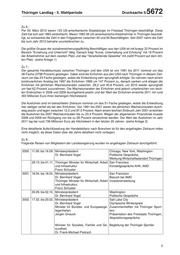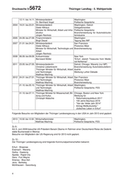 Drucksache 5/ 5672 Thüringer L andtag - 5. Wahlperiode 12.11. bis 14.11. Ministerpräsident Washington Dr. Bernhard Vogel Politische Gespräche 2004 19.01. bis 23.01. Ministerpräsident Washington, Detroit Dieter Althaus Delegationsreise Minister für Wirtschaft, Arbeit und Infra- Politische Gespräche struktur Branchenwerbung für Automobilzulie- Jürgen Reinholz ferindustrie 2005 24.09. bis 27.09. Finanzministerin Washington Birgit Diezel Tagung des IWF 2007 21.01. bis 24.01. Ministerpräsident San Francisco Dieter Althaus Photonics West Minister für Wirtschaft, Technologie und Branchenwerbung Arbeit Jürgen Reinholz 2008 06.09. bis 09.09. Kultusminister New York Bernward Müller "Erfurt: Jewish Treasures from Medie- val Ashkenaz" 2011 23.05. bis 27.05. Ministerpräsidentin Detroit, Chicago, Waverly (nur MP) Christine Lieberknecht Branchenwerbung Automobilzulieferin- Thüringer Minister für Wirtschaft, Arbeit dustrie und Technologie Werbung Luther-Dekade Matthias Machnig 2012 24.01. bis 27.01. Thüringer Minister für Wirtschaft, Arbeit San Francisco und Technologie Photonics West Matthias Machnig Branchenwerbung 21.10. bis 25.10. Thüringer Minister für Wirtschaft, Arbeit Washington, und Technologie Politische Gespräche, FES Matthias Machnig 31.10. bis 07.11. Thüringer Minister für Wissenschaft, Bil- Chicago, Boston und New York dung und Kultur, Werbung für Christoph Matschie - Reformationsjubiläum 2017 - 100 Jahre Bauhaus 2019 - "Van der Velde Jahr 2014" - Antrag Weltkulturerbe " Jüdisches Leben in Erfurt" Folgende Besuche von Mitgliedern der Thüringer Landesregierung in den USA im Jahr 2013 sind geplant: 2013 10.02. bis 12.02. Wirtschaftsminister Washington, Matthias Machnig Politische Gespräche, FES Zu 9.: Am 5. Juni 2009 besuchte US-Präsident Barack Obama im Rahmen einer Deutschland-Reise die Gedenk- stätte Buchenwald in Weimar. Besuche von Mitgliedern der US-Regierung sind für 2013 nicht geplant. Zu 10.: Der Thüringer Landesregierung sind folgende Kommunalpartnerschaften bekannt: Erfurt - Shawnee Eisenach - Waverly Gotha - Gastonia Apolda - Rapid City Gera - Fort Wayne Ilmenau - Blue Ash Jena - Berkeley Mühlhausen - Saxonburg 4
