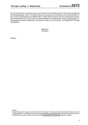 Thüringer L andtag - 5. Wahlperiode Drucksache 5/ 5672 Für die Unterstützung und Anbahnung von kommunalen Partnerschaften gelten für alle Länder die gleichen Rahmenbedingungen. Sofern Thüringer Kommunen Interesse an der Anbahnung von Partnerschaften ha- ben und die Landesregierung um Mithilfe bitten, werden diese Wünsche über die in Deutschland akkredi- tierten Botschafter bzw. Konsuln oder bei Zusammentreffen mit ausländischen Gästen weitergetragen. In- teressensbekundungen ausländischer Gemeinden werden an den Gemeinde- und Städtebund Thüringen weitergeleitet. Walsmann Ministerin *) Anlagen *) Hinweis: Auf den Abdruck der Anlagen wurde verzichtet. Ein Exemplar mit Anlagen erhielten jeweils die Fraktionen und die Landtagsbibliothek. Des Weiteren können sie im Abgeordneteninformationssystem unter der oben genannten Druck- sachennummer sowie im Internet unter der Adresse: www.parldok.thueringen.de eingesehen werden. 5