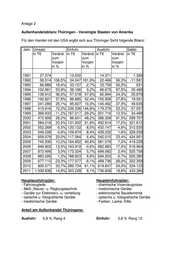 Thüringer L andtag - 5. Wahlperiode Drucksache 5/ 5672 Zu 6.: Per 30. März 2012 waren 123 US-amerikanische Staatsbürger im Freistaat Thüringen beschäftigt. Diese Zahl hat sich seit 1993 verdreifacht. Waren 1993 38 US-amerikanische Arbeitnehmer in Thüringen beschäf- tigt, so schwankte die Zahl in den Folgejahren zwischen 40 und 60 Beschäftigten. Seit 2007 nahm die Zahl bis zum Jahr 2012 beinahe ununterbrochen zu. Die größte Gruppe der sozialversicherungspflichtig Beschäftigen aus den USA ist mit knapp 32 Prozent im Bereich "Erziehung und Unterricht" tätig. Danach folgt "Kunst, Unterhaltung und Erholung" mit 19 Prozent der Arbeitnehmer auf dem zweiten Platz und das "Verarbeitende Gewerbe" mit zwölf Prozent auf dem drit- ten Platz. (siehe Anlage 1) Zu 7.: Der gesamte Handelsumsatz zwischen Thüringen und den USA ist von 1991 bis 2011 nominal um das 38-Fache (3798 Prozent) gestiegen. Dabei sind die Einfuhren aus den USA nach Thüringen in diesem Zeit- raum um das 23-Fache gestiegen, wobei die Entwicklung sehr sprunghaft erfolgte. So nahmen nach einem kontinuierlichen Anstieg bis 1997 die Einfuhren 1998 um 147 Prozent zu, danach sanken und stiegen die Einfuhren mit jährlichen Wachstumsraten zwischen -29,2 und 40,8 Prozent, um 2010 wieder sprunghaft um fast 62 Prozent zuzunehmen. Die Wachstumsraten der Einfuhren sind jedoch unterbrochen von leich- ten Einbrüchen in 2006 und 2009 durchgehend positiv und der Wert der Einfuhren erreichte 2011 mit rund 303 Millionen Euro ihren bisherigen Höchststand. Die Ausfuhren sind im betrachteten Zeitraum nominal um das 51-Fache gestiegen, wobei die Entwicklung hier stetiger verlief als bei den Einfuhren. Von 1991 bis 2001 waren die jährlichen Wachstumsraten durch- weg positiv und lagen zwischen 12,5 und 97,5 Prozent. Nach einem leichten Einbruch Jahr 2001 erreichten die Ausfuhren bis 2007 Wachstumsraten bis zu 23,4 Prozent. Wegen der allgemeinen Finanzkrise musste 2008 und 2009 ein Rückgang von bis zu 28 Prozent verzeichnet werden. Der Wert der Ausfuhren im Jahr 2011 lag bei rund 736 Millionen Euro als Höchstwert in den letzten 20 Jahren. (siehe Anlage 2) Eine detaillierte Aufschlüsselung der Handelsbilanz nach Branchen ist für den angefragten Zeitraum indes nicht möglich, da diese Daten über die Jahre detailliert nicht vorliegen. Zu 8.: Folgende Reisen von Mitgliedern der Landesregierung wurden im angefragten Zeitraum durchgeführt: 2000 11.09. bis 16.09. Ministerpräsident Chicago, New York, Washington Dr. Bernhard Vogel Politische Gespräche, Werbung Wirtschaftsstandort Thüringen 29.10. bis 01.11. Thüringer Minister für Wirtschaft, Arbeit San Francisco und Infrastruktur Kontaktgespräche AHK, AMD Franz Schuster 2001 16.04. bis 18.04. Ministerpräsident San Francisco Dr. Bernhard Vogel Besuch bei AMD Thüringer Minister für Wirtschaft, Arbeit Investorenwerbung und Infrastruktur, Franz Schuster 30.09. bis 02.10. Ministerpräsident Washington Dr. Bernhard Vogel Politische Gespräche 2002 17.02. bis 20.02. Ministerpräsident Salt Lake City Dr. Bernhard Vogel Olympische Winterspiele Minister für Bundes- und Europaange- Zusammentreffen mit Thüringer Sport- legenheiten lern Jürgen Gnauck Präsentation des Freistaats Thüringen, Akquisitionsgespräche Minister für Soziales, Familie und Ge- Begleitung der Thüringer Sportler sundheit Dr. Frank-Michael Pietzsch 3
