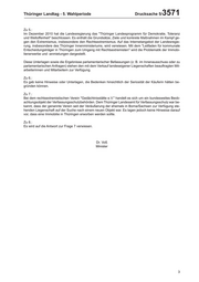 Thüringer Landtag - 5. Wahlperiode Drucksache 5/ 3571 Zu 5.: Im Dezember 2010 hat die Landesregierung das "Thüringer Landesprogramm für Demokratie, Toleranz und Weltoffenheit" beschlossen. Es enthält die Grundsätze, Ziele und konkrete Maßnahmen im Kampf ge- gen den Extremismus, insbesondere den Rechtsextremismus. Auf das Internetangebot der Landesregie- rung, insbesondere des Thüringer Innenministeriums, wird verwiesen. Mit dem "Leitfaden für kommunale Entscheidungsträger in Thüringen zum Umgang mit Rechtsextremisten" wird die Problematik der Immobi- lienerwerbe und -anmietungen dargestellt. Diese Unterlagen sowie die Ergebnisse parlamentarischer Befassungen (z. B. im Innenausschuss oder zu parlamentarischen Anfragen) stehen den mit dem Verkauf landeseigener Liegenschaften beauftragten Mit- arbeiterinnen und Mitarbeitern zur Verfügung. Zu 6.: Es gab keine Hinweise oder Unterlagen, die Bedenken hinsichtlich der Seriosität der Käuferin hätten be- gründen können. Zu 7.: Bei dem rechtsextremistischen Verein "Gedächtnisstätte e.V." handelt es sich um ein bundesweites Beob- achtungsobjekt der Verfassungsschutzbehörden. Dem Thüringer Landesamt für Verfassungsschutz war be- kannt, dass der genannte Verein seit der Veräußerung der ehemals in Borna/Sachsen zur Verfügung ste- henden Liegenschaft auf der Suche nach einem neuen Objekt war. Es lagen jedoch keine Hinweise darauf vor, dass eine Immobilie in Thüringen erworben werden sollte. Zu 8.: Es wird auf die Antwort zur Frage 7 verwiesen. Dr. Voß Minister 3