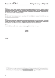 Drucksache 5/ 7081 Thüringer Landtag - 5. Wahlperiode Zu 2.: Wesentlicher Grund für die defizitäre Haushaltsentwicklung ist das stark zunehmend negative Verhältnis zwischen kommunalen Einnahmen und Ausgaben. Der Einwohnerschwund und die allgemeinen Kosten- steigerungen trugen ebenfalls zur Fehlentwicklung bei. Eine weitere Ursache sind die ansteigenden Kos- ten der Gemeinde für die Kindertagesstätten. Zu 3.: Die Gemeinde Wolkramshausen hat in den Jahren 2011 und 2012 keine weiteren Finanzhilfen aus dem Landesausgleichsstock erhalten. Zu 4.: Die fiskalischen Wirkungen der einzelnen Konsolidierungsmaßnahmen sind die Erhöhung der Einnahmen und die Reduzierung der Ausgaben. Im Wesentlichen handelt es sich um die Reduzierung der Ausgaben des sächlichen Verwaltungsaufwandes und Mehreinnahmen bei Steuern und Gebühren. Zu 5.: Im Jahr 2023 soll die Gemeinde die dauernde Leistungsfähigkeit wieder erlangen. Geibert Minister Anlage*) *) Hinweis: Auf den Abdruck der Anlage wurde verzichtet. Ein Exemplar mit Anlage erhielten jeweils die Fraktionen und die Land- tagsbibliothek. Des Weiteren kann sie im Abgeordneteninformationssystem unter der oben genannten Drucksachen- nummer sowie im Internet unter der Adresse: www.parldok.thueringen.de eingesehen werden. 2