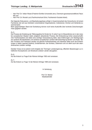 Thüringer Landtag - 5. Wahlperiode Drucksache 5/ 3143 - Herr Prof. Dr. Volker Woest (Friedrich-Schiller-Universität Jena, Chemisch-geowissenschaftliche Fakul- tät) und - Herr Prof. Dr. Ronald Lutz (Fachhochschule Erfurt, Fachbereich Soziale Arbeit). Die folgende Diskussions- und Bearbeitungsphase erfolgt in Zusammenarbeit des Konsortiums mit einem Fachbeirat, der sich aus Vertretern verschiedener Organisationen, Institutionen, Kirchen und Verbände zu- sammensetzt. Beim gegenwärtigen Stand der Erarbeitung können noch keine Auskünfte über konkrete Zwischenergeb- nisse gegeben werden. Zu 5.: Der Prozess der Erstellung der "Bildungspläne für Kinder bis 10 Jahre" war im Wesentlichen ein in den meis- ten europäischen Staaten relativ zeitgleich ablaufender Prozess. Die Einbeziehung hoher wissenschaftli- cher Fachkompetenz bot dabei eine wichtige Voraussetzung dafür, dass Erfahrungen und Überlegungen aus anderen Bundesländern und anderen europäischen Ländern Berücksichtigung fanden und finden. Ne- ben Finnland und Frankreich werden mit gleicher Aufmerksamkeit und Interesse dabei auch die Entwick- lungen in Italien (speziell Südtirol), Großbritannien, der Schweiz, Österreich und vor allem auch den skan- dinavischen Ländern verfolgt. Darüber hinaus ist es jedoch nicht Aufgabe der Thüringer Landesregierung, öffentlich Bewertungen zu in- haltlichen Konzeptionen und Strukturen anderer Länder abzugeben. Zu 6.: Auf die Antwort zu Frage 8 der Kleinen Anfrage 1592 wird verwiesen. Zu 7.: Auf die Antwort zu Frage 12 der Kleinen Anfrage 1596 wird verwiesen. In Vertretung Prof. Dr. Merten Staatssekretär 3