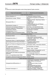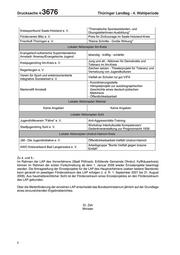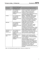 Drucksache 4/ 3676 Thüringer Landtag - 4. Wahlperiode "Thematische Sportassistenten- und Kreissportbund Saale-Holzland e. V. ÜbungsleiterInnen-Ausbildung" Förderverein Blitz e. V. Preis für Zivilcourage im Saale-Holzland-Kreis Frischluft Thüringen e. V. "Kleine Schritte - Große Wirkung" Lokaler Aktionsplan Ilm-Kreis Evangelisch-lutherische Superintendentur lebendig - kräftig - schärfer Arnstadt- Ilmenau/Evangelische Jugend Jung und alt - Aktionen für Demokratie und Kreisjugendring Ilm-Kreis e. V. Toleranz im Ilm-Kreis Zeichen setzen - Theaterprojekt für Toleranz und Regenbogen e. V. Vernetzung von Jugendkulturen Verein für Sport und erlebnisorientierte Vielfalt an Schulen tut gut VIFA integrative Sozialarbeit e. V. - Koordinierungsstelle - Hörspielprojekt zur autobiographischen Marienstift Arnstadt Geschichte eines deutsch-jüdischen Mädchens - Öffentlichkeitsarbeit Lokaler Aktionsplan Weimar Keine Angaben Keine Angaben Lokaler Aktionsplan Suhl Jugendhilfeverein "Fähre" e. V. Anti-Aggressivitäts-Training Workshop Interkulturelle Kompetenzen/ Stadtjugendring Suhl e. V. Gedenkveranstaltung zur Progromnacht 1938 Lokaler Aktionsplan Unstrut-Hainich-Kreis JiM - Die Jugendinitiative e. V. Öffentlichkeitsarbeit-Vielfalt Unstrut-Hainich Arbeitsgruppe "Bunte Vielfalt gegen braune AWO Kreisverband Bad Langensalza e. V. Einfalt" Zu 4. und 5.: Im Rahmen der LAP des Vorverfahrens (Stadt Pößneck, Erfüllende Gemeinde Ohrdruf, Kyffhäuserkreis) können im Rahmen der ersten Fortschreibung ab dem 1. Januar 2008 wieder Einzelprojekte beantragt werden. Die Antragstellung der Einzelprojekte für die LAP des Hauptverfahrens (sieben weitere Standorte) kann generell im jeweiligen Förderzeitraum des LAP erfolgen (i. d. R. 1. September 2007 bis 31. August 2008). Aus haushaltsrechtlicher Sicht ist der Förderzeitraum eines Einzelprojektes an den Förderzeitraum des LAP gebunden. Über die Weiterförderung der einzelnen LAP entscheidet das Bundesministerium jährlich auf der Grundlage eines einzureichenden Ergebnisberichtes. Dr. Zeh Minister 6