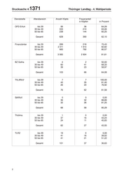 Drucksache 4/ 1371 Thüringer Landtag - 4. Wahlperiode Dienststelle Altersbereich Anzahl Köpfe Frauenanteil in Köpfen in Prozent OFD Erfurt bis 29 56 36 64,29 30 bis 49 333 210 63,06 50 bis 65 239 144 60,25 Gesamt 628 390 62,10 Finanzämter bis 29 289 218 75,43 30 bis 49 2 311 1 914 82,82 50 bis 65 983 792 80,57 Gesamt 3 583 2 924 81,61 BZ Gotha bis 29 4 2 50,00 30 bis 49 60 41 68,33 50 bis 65 39 23 58,97 Gesamt 103 66 64,08 ThLARoV bis 29 7 7 100,00 30 bis 49 43 35 81,40 50 bis 65 26 20 76,92 Gesamt 76 62 81,58 StARoV bis 29 0 0 0,00 30 bis 49 36 32 88,89 50 bis 65 32 26 81,25 Gesamt 68 58 85,29 Thülima bis 29 1 0 0,00 30 bis 49 37 16 43,24 50 bis 65 24 11 45,83 Gesamt 62 27 43,55 TLRZ bis 29 19 0 0,00 30 bis 49 41 16 39,02 50 bis 65 41 21 51,22 Gesamt 101 37 36,63 2