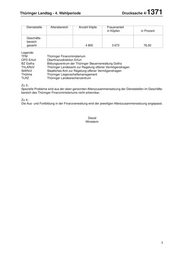 Thüringer Landtag - 4. Wahlperiode Drucksache 4/ 1371 Dienststelle Altersbereich Anzahl Köpfe Frauenanteil in Köpfen in Prozent Geschäfts- bereich gesamt 4 800 3 672 76,50 Legende: TFM Thüringer Finanzministerium OFD Erfurt Oberfinanzdirektion Erfurt BZ Gotha Bildungszentrum der Thüringer Steuerverwaltung Gotha ThLARoV Thüringer Landesamt zur Regelung offener Vermögensfragen StARoV Staatliches Amt zur Regelung offener Vermögensfragen Thülima Thüringer Liegenschaftsmanagement TLRZ Thüringer Landesrechenzentrum Zu 3.: Spezielle Probleme sind aus der oben genannten Alterszusammensetzung der Dienststellen im Geschäfts- bereich des Thüringer Finanzministeriums nicht erkennbar. Zu 4.: Die Aus- und Fortbildung in der Finanzverwaltung wird der jeweiligen Alterszusammensetzung angepasst. Diezel Ministerin 3