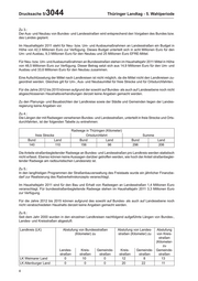 Thüringer Landtag 5. Wahlperiode Drucksache 5/ 3044 06.07.2011 Kleine Anfrage der Abgeordneten Schubert (BÜNDNIS 90/DIE GRÜNEN) und Antwort des Thüringer Ministeriums für Bau, Landesentwicklung und Verkehr Straßenstatistik der Thüringer Landkreise Die Kleine Anfrage 1507 vom 19. Mai 2011 hat folgenden Wortlaut: Laut dem Landesentwicklungsbericht 2009 verfügt Thüringen über ein ausreichend dichtes Straßennetz. Dennoch werden trotz sinkender Verkehrszahlen neue Straßen gebaut, die es zukünftig zu erhalten gilt. Statt weiter auf umwelt- und klimaschädlichen Verkehr zu setzen, brauchen wir eine nachhaltige und vor allem realistische Verkehrspolitik, denn mehr Straßen sind nicht gleichbedeutend mit mehr Lebensqualität. Ich frage die Landesregierung: 1. Wie viele Kilometer Bundesstraßen, Landesstraßen, Kreisstraßen und Gemeindestraßen gibt es in Thü- ringen (bitte aufgeschlüsselt nach Landkreisen sowie in freie Strecke und Ortsdurchfahrten)? 2. Wie viele Streckenkilometer davon befinden sich in gutem bis sehr gutem, schlechtem und sehr schlech- tem Zustand (bitte aufgeschlüsselt nach Landkreisen)? 3. Inwiefern ist der Aus- und Neubau von Straßen im Zeitraum von 2011 bis 2015 vorgesehen und welche finanziellen Mittel stehen dafür zur Verfügung (bitte aufgeschlüsselt nach Landkreisen sowie in freie Stre- cke und Ortsdurchfahrten)? 4. Wie viele Kilometer Radwege gibt es in Thüringen (bitte aufgeschlüsselt nach Landkreisen sowie in freie Strecke und Ortsdurchfahrten) a) an Bundesstraßen; b) an Landesstraßen; c) eingebunden in das touristische Landesradwegenetz? 5. Inwiefern ist der Aus- und Neubau von Radwegen im Zeitraum von 2011 bis 2015 vorgesehen und wel- che finanziellen Mittel stehen dafür zur Verfügung (bitte aufgeschlüsselt nach Landkreisen sowie in freie Strecke und Ortsdurchfahrten)? 6. Welche Bundes-, Landes- und Kreisstraßen wurden seit dem Jahr 2000 in Thüringen abgestuft? 7. Welche Bundes-, Landes- und Kreisstraßen sollen im Zeitraum 2011 bis 2015 abgestuft werden? a) In welchem Zustand sollen die Straßen übergeben werden? b) Wie wird die Übernahme der Kosten geregelt? c) Welche Mittel stehen für die Förderung der Sanierung für die Landkreise und Städte, an die Landes- straßen übertragen werden, zur Verfügung? d) Nach welchen Kriterien soll die Förderung erfolgen? Druck: Thüringer Landtag, 18. Juli 2011