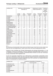 Drucksache 5/ 3044 Thüringer Landtag - 5. Wahlperiode Das Thüringer Ministerium für Bau, Landesentwicklung und Verkehr hat die Kleine Anfrage namens der Landesregierung mit Schreiben vom 4. Juli 2011 wie folgt beantwortet: Zu 1.: In der folgenden Tabelle wurden die Straßenlängen von Bundes-, Landes- und Kreisstraßen nach Landkrei- sen geordnet zusammengestellt. Landkreis (LK) freie Strecke Ortsdurchfahrt Summe (in Kilometer) (in Kilometer) (in Kilometer) Bund Land Kreis Bund Land Kreis Bund Land Kreis LK Weimarer Land 66 135 141 16 56 45 82 191 186 LK Altenburg 58 98 142 27 44 83 85 142 225 Eichsfeldkreis 35 329 101 7 104 29 42 433 130 LK Gotha 76 185 64 29 83 26 105 268 90 LK Greiz 81 150 155 33 74 64 114 224 219 LK Hildburghausen 35 213 140 16 73 31 51 286 171 Ilm-Kreis 29 213 105 21 73 30 50 286 135 LK Kyffhäuser 83 227 70 21 70 20 104 297 90 LK Nordhausen 42 184 73 17 75 16 59 259 89 Saale-Holzland-Kreis 38 197 198 18 66 52 56 263 250 LK Saalfeld-Rudolstadt 86 193 177 49 73 55 135 266 232 LK Schmalkalden-Mei- 47 237 152 17 121 20 64 358 172 ningen LK Sonneberg 31 73 71 17 44 31 48 117 102 Saale-Orla-Kreis 90 262 206 19 65 63 109 327 269 LK Sömmerda 80 128 75 22 38 30 102 166 105 Unstrut-Hainich-Kreis 79 254 63 24 77 16 103 331 79 Wartburgkreis 129 229 135 47 95 48 176 324 183 Stadt Eisenach 20 22 15 10 1 3 30 23 18 Stadt Erfurt 8 37 0 1 10 195 9 47 195 Stadt Gera 16 13 30 16 13 14 32 26 44 Stadt Jena 11 7 28 18 8 0 29 15 28 Stadt Weimar 18 3 1 10 6 1 28 9 2 Stadt Suhl 0 9 6 0 17 8 0 26 14 Summe 1 158 3 398 2 148 455 1 286 880 1 613 4 684 3 028 Thüringen verfügt zudem über insgesamt 498 Kilometer Bundesautobahnen. Zur Länge der Gemeindestra- ßen liegen der Landesregierung keine Angaben vor. Zu 2.: Das Ergebnis der zuletzt im Jahr 2008 durchgeführten Zustandserfassung und -bewertung (ZEB) der Bun- des- und Landesstraßen kann der nachstehenden Tabellen entnommen werden. Als Zustandswert dient dabei der sogenannte "Substanzwert Oberfläche", der den Straßenzustand anhand der Faktoren Flickstel- len/Risse (Flächenanteile), Spurrinnentiefe und allgemeine Unebenheiten, die mittels Messfahrzeugen er- mittelt werden, beschreibt. 2