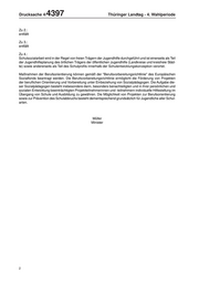 THÜRINGERLandtag Thüringer LANDTAG - 4. Wahlperiode Drucksache 4/ 4397 4. Wahlperiode 02.09.2008 Kleine Anfrage der Abgeordneten Hennig (DIE LINKE) und Antwort des Thüringer Kultusministeriums Schulsozialarbeit an Thüringer Berufsschulen Die Kleine Anfrage 2476 vom 17. Juli 2008 hat folgenden Wortlaut: Aus der Beantwortung der Großen Anfrage der Fraktion DIE LINKE zur Bewertung der EU-Förderperiode 2000 bis 2006 (Drucksache 4/4107) geht hervor, dass eine Förderung der Schulsozialarbeit an den Berufs- schulen in der Förderperiode 2007 bis 2013 nicht vorgesehen ist. Das Operationelle Programm des Europä- ischen Sozialfonds (ESF) biete jedoch die Möglichkeit, sowohl Maßnahmen der Berufsorientierung mit so- zialpädagogischer Begleitung als auch die sozialpädagogische Betreuung zur Prävention des Schulab- bruchs von Jugendlichen im Rahmen von Projekten zu fördern. Ich frage die Landesregierung: 1. Wie viele Anträge auf Förderung von Maßnahmen der Berufsorientierung, die inhaltlich auf die Durch- führung der Schulsozialarbeit abzielen, lagen und liegen der Gesellschaft für Arbeits- und Wirtschaftsför- derung des Freistaats Thüringen mbH (GFAW) zur Prüfung und Bewilligung seit Beginn der Förderperi- ode 2007 bis 2013 vor? 2. Welche entsprechenden Projekte wurden seit Beginn der Förderperiode 2007 bis 2013 beantragt und bewilligt (bitte aufgeschlüsselt nach Jahresscheiben, Projektträger, Durchführungsort und -zeitraum des Projektes sowie Teilnehmerzahl angeben)? 3. In welcher Höhe wurden ESF-Fördermittel für diese unter Frage 2 genannten Projekte bewilligt (bitte aufgeschlüsselt nach Projektträger, Höhe der ESF-Fördermittel, Jahresscheiben und Teilnehmerzahl angeben)? 4. Welche Möglichkeiten sieht die Landesregierung, die Förderung von Schulsozialarbeit auf den Einsatz von Schulsozialarbeitern in Regelschulen und Gymnasien des Freistaats zu erweitern, um dort ebenfalls Maßnahmen zur Berufsorientierung mit sozialpädagogischer Beratung und Betreuung und damit zur Vermeidung von Schulabbrüchen umzusetzen? Das Thüringer Kultusministerium hat die Kleine Anfrage namens der Landesregierung mit Schreiben vom 1. September 2008 wie folgt beantwortet: Zu 1.: keine Druck: Thüringer Landtag, 9. September 2008 1