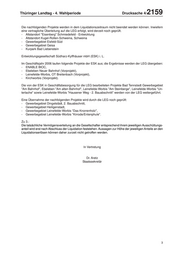 Thüringer Landtag - 4. Wahlperiode Drucksache 4/ 2159 Die nachfolgenden Projekte werden in dem Liquidationszeitraum nicht beendet werden können. Inwiefern eine vertragliche Überleitung auf die LEG erfolgt, wird derzeit noch geprüft. - Altstandort "Eisenberg" Schmiedefeld - Entwicklung - Altstandort Kugel-Rollen-Schweina, Schweina - Gewerbegebiet Eisfeld-Süd - Gewerbegebiet Geisa - Kurpark Bad Liebenstein Entwicklungsgesellschaft Südharz-Kyffhäuser mbH (ESK) i. L. Im Geschäftsjahr 2006 laufen folgende Projekte der ESK aus; die Ergebnisse werden der LEG übergeben: - ENABLE BIOC, - Ebeleben Neuer Bahnhof (Vorprojekt), - Leinefelde-Worbis, OT Breitenbach (Vorprojekt), - Kirchworbis (Vorprojekt). Die von der ESK in Geschäftsbesorgung für die LEG bearbeiteten Projekte Bad Tennstedt Gewerbegebiet "Am Bahnhof", Ebeleben "Am alten Bahnhof", Leinefelde-Worbis "Am Steinberge", Leinefelde-Worbis "Un- terlache" sowie Leinefelde-Worbis "Hausener Weg - 2. Bauabschnitt" werden von der LEG weitergeführt. Eine Übernahme der nachfolgenden Projekte wird durch die LEG noch geprüft: - Gewerbegebiet Dingelstädt, 2. Bauabschnitt, - Gewerbegebiet Heiligenstadt, - Gewerbegebiet Leinefelde-Worbis "Das Knorrenholz", - Gewerbegebiet Leinefelde-Worbis "Kirrode/Entenphule". Zu 3.: Die tatsächliche Vermögensverteilung an die Gesellschafter entsprechend ihrem jeweiligen Ausschüttungs- anteil wird erst nach Abschluss der Liquidation feststehen. Aussagen zur Höhe der jeweiligen Anteile an den Liquidationserlösen können daher zurzeit nicht getroffen werden. In Vertretung Dr. Aretz Staatssekretär 3