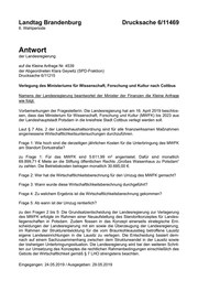 Landtag Brandenburg Drucksache 6/11469 6. Wahlperiode Antwort der Landesregierung auf die Kleine Anfrage Nr. 4539 der Abgeordneten Klara Geywitz (SPD-Fraktion) Drucksache 6/11215 Verlegung des Ministeriums für Wissenschaft, Forschung und Kultur nach Cottbus Namens der Landesregierung beantwortet der Minister der Finanzen die Kleine Anfrage wie folgt: Vorbemerkungen der Fragestellerin: Die Landesregierung hat am 16. April 2019 beschlos- sen, dass das Ministerium für Wissenschaft, Forschung und Kultur (MWFK) bis 2023 aus der Landeshauptstadt Potsdam in die kreisfreie Stadt Cottbus verlegt werden soll. Laut § 7 Abs. 2 der Landeshaushaltsordnung sind für alle finanzwirksamen Maßnahmen angemessene Wirtschaftlichkeitsuntersuchungen durchzuführen. Frage 1: Wie hoch sind die derzeitigen jährlichen Kosten für die Unterbringung des MWFK am Standort Dortustraße? zu Frage 1: Für das MWFK sind 5.611,99 m² angemietet. Dafür sind monatlich 69.899,71 € Miete an die Stiftung öffentlichen Rechts „Großes Waisenhaus zu Potsdam“ zu zahlen. Die Betriebskosten betragen monatlich 30.685,00 €. Frage 2: Wer hat die Wirtschaftlichkeitsberechnung für den Umzug des MWFK gemacht? Frage 3: Wann wurde diese Wirtschaftlichkeitsberechnung durchgeführt? Frage 4: Zu welchem Ergebnis ist die Wirtschaftlichkeitsberechnung gekommen? Frage 5: Ab wann ist der Umzug rentierlich? zu den Fragen 2 bis 5: Die Grundsatzentscheidung der Landesregierung zur Verlagerung des MWFK erfolgte im Rahmen einer Neuaufstellung des Standortkonzeptes für Landes- liegenschaften in Potsdam. Zudem flossen in das Konzept einerseits strategische Ent- scheidungen der Landesregierung mit ein sowie die Überzeugung der Landesregierung, im Rahmen der Strukturentwicklung für die vom Braunkohleausstieg betroffene Lausitz eigene Landeseinrichtungen in die Lausitz zu verlegen. Die Entscheidung basiert dem- nach auf einem Sachzusammenhang zwischen dem Strukturwandel in der Lausitz sowie der bisherigen Unterbringungssituation. Die Landesregierung wird bei den weiteren Schrit- ten zur Umsetzung des Konzeptes die rechtlichen Rahmenbedingungen einschließlich des Gebots der Wirtschaftlichkeit gemäß § 7 LHO strengstens beachten. Eingegangen: 24.05.2019 / Ausgegeben: 29.05.2019