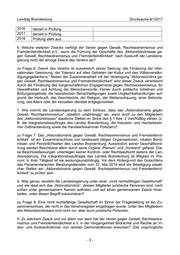 Landtag Brandenburg Drucksache 6/12017 2016 derzeit in Prüfung 2017 derzeit in Prüfung 2018 Prüfung steht aus 6. Welche weiteren Zwecke verfolgt der Verein gegen Gewalt, Rechtsextremismus und Fremdenfeindlichkeit e.V., wenn die Führung der Geschäfte des „Aktionsbündnisses ge- gen Gewalt, Rechtsextremismus und Fremdenfeindlichkeit“ nach Auskunft der Landesre- gierung nicht der einzige Zweck des Vereins sei? zu Frage 6: Zweck des Vereins ist ausweislich seiner Satzung „die Förderung der inter- nationalen Gesinnung, der Toleranz auf allen Gebieten der Kultur und des Völkerverstän- digungsgedankens.“ Neben der Zusammenarbeit mit der Vereinigung “Aktionsbündnis ge- gen Gewalt, Rechtsextremismus und Fremdenfeindlichkeit“ wird dieser Zweck verwirklicht durch die Förderung des bürgerschaftlichen Engagements gegen Rechtsextremismus, für Gewaltfreiheit und Achtung der Menschenwürde. Ferner durch politische Initiativen und Bildungsangebote, die rassistischen Benachteiligungen sowie Ungleichbehandlungen auf- grund der Herkunft, des Geschlechts, der Religion, der Weltanschauung, einer Behinde- rung, des Alters oder der sexuellen Identität entgegenwirken. 7. Wie kommt die Landesregierung zu dem Schluss, dass das „Aktionsbündnis gegen Gewalt, Rechtsextremismus“ „staatlich unabhängig“ sei, wenn doch zu den Mitgliedern des „Aktionsbündnisses“ staatliche Stellen im Sinne des § 1 Abs. 2 VwVfGBbg zählen (z. B. die Integrationsbeauftragte des Landes Brandenburg, die Industrie- und Handelskam- mer Ostbrandenburg sowie die Handwerkskammer Potsdam)? zu Frage 7: Das „Aktionsbündnis gegen Gewalt, Rechtsextremismus und Fremdenfeind- lichkeit“ ist ein Zusammenschluss von landesweit tätigen Organisationen, lokalen Bünd- nissen und Persönlichkeiten des Landes Brandenburg. Ausweislich seiner Geschäftsord- nung werden Beschlüsse allein durch seine Organe „Plenum“ und „Vorstand“ gefasst. Die- se Beschlussfassungen unterliegen keiner Kontroll- oder Rechtsaufsicht seitens der Lan- desregierung. Die Integrationsbeauftragte des Landes Brandenburg ist Mitglied im Ple- num; in ihrer Tätigkeit ist sie weisungsunabhängig. Vor dem Hintergrund des Gutachtens des Parlamentarischen Beratungsdienstes vom 22. Mai 2019 wird die Beteiligung staatli- cher Stellen am „Aktionsbündnis gegen Gewalt, Rechtsextremismus und Fremdenfeind- lichkeit“ zu prüfen sein. 8. Was genau versteht die Landesregierung unter einer „nicht rechtsfähigen Gesellschaft“ und wie lässt sich das „Aktionsbündnis“, dessen Mitglieder juristische Personen sind, nach außen unter gemeinsamem Namen auftreten und auf einen gemeinsamen Zweck hinar- beiten, unter diesen Begriff subsumieren? zu Frage 8: Eine nicht rechtsfähige Gesellschaft im Sinne der Fragestellung ist ein Zu- sammenschluss, der nicht in das Vereinsregister eingetragen wurde. Unter den Mitgliedern des Aktionsbündnisses sind nicht nur, aber auch juristische Personen. 9. Zu welchem Zweck und vor allem von wem hat der Verein gegen Gewalt, Rechtsextre- mismus und Fremdenfeindlichkeit e.V. in der Vergangenheit Bildrechte und Rechte an Vi- deo- und Audioaufnahmen von rechten Demonstrationen erworben? (Die ursprüngliche -3-