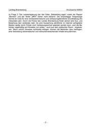 Landtag Brandenburg Drucksache 6/8504 zu Frage 2: Der Landesregierung war das Video „Babelsberg jagen“ sowie der Rapper „Moment“ und der Texter „MRX“ bisher nicht bekannt. Die einschlägige Textpassage könnte ein Indiz für eine rechtsextremistische und verfassungsfeindliche Grundhaltung des Interpreten sein. Durch die Polizei des Landes Brandenburg findet derzeit eine Aus- und Bewertung des Liedtextes statt. Da eine Auswertung sämtlicher im Internet verfügbarer Medien weder durch Polizei noch Verfassungsschutz geleistet werden kann, sind die Be- hörden regelmäßig auf Hinweise von außen - auch aus dem politischen Raum - angewie- sen. Wenn solche Hinweise rechtzeitig erfolgen, können die Behörden dazu beitragen, eine Verbreitung extremistischer und menschenverachtender Inhalte einzudämmen. -2-
