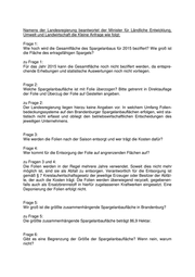 Landtag Brandenburg Drucksache 6/1439 6. Wahlperiode Antwort der Landesregierung auf die Kleine Anfrage 533 des Abgeordneten Sven Schröder der AfD-Fraktion Drucksache 6/1196 Erfolgsgeschichte Spargel in Brandenburg – Hinter die Kulissen geschaut Wortlaut der Kleinen Anfrage 533 vom 21.04.2015: Laut Daten des MLUL war das Jahr 2014 ein Rekordjahr der Spargelernte: Auf 4200 Hektar (davon 2860 Hektar im Ertrag) wurden 59,9 Dezitonnen pro Hektar gesto- chen. Bei diesen Zahlen stellt sich die Frage der Umweltverträglichkeit des Anbaus von Spargel. Ich frage die Landesregierung: 1) Wie hoch wird die Gesamtfläche des Spargelanbaus für 2015 beziffert? Wie groß ist die Fläche des ertragsfähigen Spargels? 2) Welche Spargelanbaufläche ist mit Folie überzogen? Bitte getrennt in Direkt- auflage der Folie und Überzug der Folie auf Gestellen angeben. 3) Wie werden die Folien nach der Saison entsorgt und wer trägt die Kosten da- für? 4) Wer kommt für die Entsorgung der Folie auf angrenzenden Flächen auf? 5) Wir groß ist die größte zusammenhängende Spargelanbaufläche in Branden- burg? 6) Gibt es eine Begrenzung der Größe der Spargelanbaufläche? Wenn nein, wa- rum nicht? 7) Wie bewertet die Landesregierung die Umweltbelastung durch den Sparge- lanbau? Hier bitte insbesondere auf folgende Punkte eingehen: (a) fehlendes Nahrungsangebot für Fauna, (b) Entsorgung der Folien auf (Brandenburger) Deponien, (c) Bodenerosion und (d) Nachnutzung der ausgelaugten Böden. 8) Wie viele Spargelbaubetriebe gibt es in Brandenburg und wie viele davon werden von ortsansässigen Landwirten geführt? 9) Gibt es Vermarktungskooperationen mit regionalen Händlern?