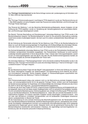 THÜRINGERLandtag Thüringer LANDTAG - 4. Wahlperiode Drucksache 4/ 4999 4. Wahlperiode 13.03.2009 Kleine Anfrage des Abgeordneten Gentzel (SPD) und Antwort des Thüringer Innenministeriums Folgen der Auflösung des Polizeiverwaltungsamtes Die Kleine Anfrage 2669 vom 22. Januar 2009 hat folgenden Wortlaut: Die Landesregierung führte in ihrer Einbringungsrede des Gesetzentwurfs zur Vorbereitung der Neustruktu- rierung der Thüringer Polizei aus, dass ein Eckpunkt der Neukonstruktion die Bündelung und Verlagerung von Aufgaben des bisherigen Polizeiverwaltungsamtes sei. Mit der Verlagerung der vollzugspolizeilichen Aufgaben und polizeilichen Serviceaufgaben in andere Behörden und Einrichtungen der Polizei seien mess- bare Synergieeffekte zu erzielen sowie Personal- und Kosteneinsparungen verbunden. Ich frage die Landesregierung: 1. Welche anderen Behörden nehmen die Aufgaben des früheren Polizeiverwaltungsamtes wahr und wie sind diese Aufgaben organisatorisch in diese Behörden eingeordnet worden? 2. Welche "vollzugspolizeilichen" Aufgaben hatte das Polizeiverwaltungsamt wahrgenommen? 3. Welche Vorteile sind dadurch entstanden, dass das Beschaffungswesen und die Rentenstelle von der Bereitschaftspolizei übernommen wurden? 4. Welche "messbaren" Synergieeffekte sowie Personal- und Kosteneinsparungen sind durch die Auflö- sung des Polizeiverwaltungsamtes entstanden? 5. Welche Kosten entstehen jährlich durch die Versetzung des früheren Leiters des Polizeiverwaltungsam- tes in den einstweiligen Ruhestand? 6. Weshalb konnte der frühere Leiter des Polizeiverwaltungsamtes nicht auf einem anderen Dienstposten verwendet werden? Weshalb wurde kein Versuch unternommen, ihn über die Personalentwicklungsstel- le zu vermitteln? 7. Ist es rechtlich zulässig und mit dem Haushaltsrecht vereinbar, einen Beamten nach einer Behördenauf- lösung in den einstweiligen Ruhestand zu versetzen, wenn er auf einem anderen Dienstposten des gleichen Dienstherrn einsetzbar wäre? Wenn ja, woraus ergibt sich dies? 8. Sollte die Versetzung rechtlich unzulässig bzw. mit dem Haushaltsrecht nicht vereinbar sein: Wie bewer- tet die Landesregierung die Ruhestandsversetzung? Liegt eine Pflichtverletzung vor und könnte von den Verantwortlichen Schadensersatz gefordert werden? Druck: Thüringer Landtag, 25. März 2009 1