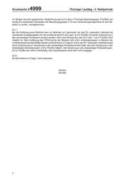 Drucksache 4/ 4999 Thüringer Landtag - 4. Wahlperiode Im Übrigen wird der gesetzlichen Verpflichtung des § 41a Satz 3 Thüringer Beamtengesetz (ThürBG), bei künftig frei werdenden Planstellen der Besoldungsgruppe A 16 eine Verwendungsmöglichkeit für den Be- amten zu prüfen, nachgekommen. Zu 7.: Bei der Auflösung einer Behörde kann ein Beamter auf Lebenszeit, der das 50. Lebensjahr vollendet hat und dessen Aufgabengebiet von der Auflösung berührt wird, gem. § 41a ThürBG mit seiner Zustimmung in den einstweiligen Ruhestand versetzt werden, wenn eine Versetzung nach § 31 Abs. 1 bis 4 ThürBG nicht möglich ist. Nach Auflösung des TPVA konnte der Beamte nicht mehr amtsangemessen im Bereich der Landesverwaltung beschäftigt werden (siehe Antwort zu Frage 6). Da er das 50. Lebensjahr vollendet sowie seine Zustimmung zur Versetzung in den einstweiligen Ruhestand erteilt hatte, war eine Versetzung in den einstweiligen Ruhestand gem. § 41a ThürBG möglich. Die Versetzung in den einstweiligen Ruhestand gem. § 41a ThürBG war mithin rechtmäßig. Das Haushaltsrecht steht dem nicht entgegen. Zu 8.: Auf die Antwort zu Frage 7 wird verwiesen. Scherer Minister 4