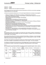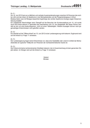 Drucksache 5/ 4991 Thüringer Landtag - 5. Wahlperiode 23:57 Uhr 4. Notruf 23:58 Uhr 5. Notruf 00:02 Uhr Funkspruch über den Angriff auf eine Beamtin Nach Entgegennahme des ersten Notrufs wurde der Sachverhalt um 23:55 Uhr an den örtlich zuständigen Inspektionsdienst per Funk übermittelt. Im Rahmen der polizeilichen Maßnahmen vor Ort wurden folgende Maßnahmen veranlasst und durchgeführt: - Anfahrt zum Einsatzort unter Wahrnahme von Sonder- und Wegerechten (ab 23:55 Uhr), - Feststellung und Befragung von Zeugen und Geschädigten zum Sachverhalt, Tatablauf und Tatverdäch- tigen und deren Personenbeschreibung, - Tatortbereichsfahndung nach den flüchtigen Tatverdächtigen, - Täterfeststellung, - Zuführung weiterer Einsatzkräfte zum Einsatzort (ab 00:02 Uhr), - Identitätsfeststellung und Lichtbildfertigung der Tatverdächtigen, - Ermittlungen von Zeugen und Durchführung von Befragungen/Vernehmungen zur Klärung und Beweis- sicherung der Tatbeteiligung, - Gegenüberstellung zwischen Tatverdächtigen, Zeugen und Geschädigten, - Identifizierung der Tatverdächtigen durch Zeugen vor Ort, - Durchführung von Atemalkoholtests bei allen Tatverdächtigen, - Tatortübernahme durch die Kriminalpolizeiinspektion (KPI) Erfurt zum Zwecke einer gerichtsverwertba- ren Spurensicherung am Tatort (u. a. Spurensicherung an Tatverdächtigen, Sicherstellung von Oberbe- kleidungsstücken), - Verbringung einer Tatverdächtigen zur erkennungsdienstlichen Behandlung in die KPI Erfurt, - Durchsetzung von Platzverweisungen für alle Tatverdächtigen mit zeitlicher und räumlicher Beschrän- kung auf die Erfurter Innenstadt. Zu 9.: Der polizeiliche Einsatz wurde unmittelbar nach Eingang des ersten Notrufs ausgelöst. Einsatzkräfte des Inspektionsdienstes Erfurt-Nord begaben sich sofort zum Einsatzort. Im Weiteren wird auf die Antworten zu den Fragen 7 und 8 verwiesen. Der Landespolizeiinspektion Erfurt standen ausreichend Einsatzkräfte zur Verfügung, um die notwendigen Maßnahmen vor Ort zur Sicherung des Strafverfahrens sowie zur Gefahrenabwehr zu treffen. Zur Kräfte- bilanz wird auf die Antwort zur Frage 6 verwiesen. Der Einsatz wird insgesamt als angemessen bewertet. Der Verdacht hinsichtlich politisch motivierter Straf- taten wurde von Beginn an berücksichtigt. Auf die Antworten zu den Fragen 1 und 2 wird verwiesen. Es erfolgte eine umfangreiche Einsatzauswertung. Schlussfolgerungen für eine grundsätzliche Optimierung des polizeilichen Handelns, insbesondere der begleitenden Öffentlichkeitsarbeit, wurden gezogen. Zu 10.: Der Landesregierung sind folgende Straftaten der politisch motivierten Gewaltkriminalität - Rechts - bekannt: Anzahl Tatzeit Ort Straftat Paragraf Tatver- Verletzte Schaden Ermittlungsstand dächtige 12.01. Erfurt Körperver- § 223 StGB* 1 0 0 TH1150-000248-11/7, 2011 letzung Abgabe StA Erfurt (Versuch) 620 Js 7983/11 30.05. Erfurt Gefährli- § 224 StGB 1 0 0 TH1105-014660-11/6, 2011 che Kör- Abgabe StA Erfurt perverlet- 590 Js 18468/11 zung 40 TS je 10,00 Euro (Versuch) * Strafgesetzbuch 4