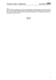 Thüringer Landtag - 5. Wahlperiode Drucksache 5/ 280 Zu 6.: Die Anrechnung von Einkommen auf den Bezug staatlicher Fürsorgeleistungen und Ausnahmen davon werden vom Bundesgesetzgeber geregelt. Die Landesregierung wird sich entsprechend den Vereinbarun- gen von CDU und SPD im Thüringer Koalitionsvertrag im Bundesrat für eine Unterstützung einkommens- schwächerer Familien einsetzen. Walsmann Ministerin 3