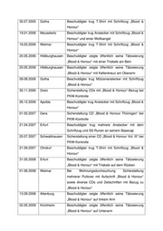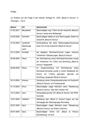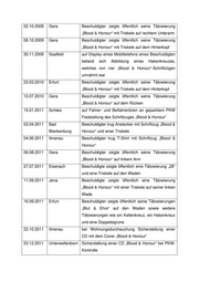 Anlage zur Antwort auf die Frage 9 der Kleinen Anfrage Nr. 2764 „Blood & Honour“ in Thüringen – Teil 2 Datum Ort Sachverhalt 07.02.2001 Meuselwitz Beschuldigter trug T-Shirt mit der Aufschrift „Blood & Honour“ sowie eine Wolfsangel 04.09.2002 Schmölln Beschuldigter klebte an eine Wohnungstür Zettel mit Aufschrift „Blood & Honour“ 27.02.2003 Landkreis Sicherstellung bei einer Wohnungsdurchsuchung Altenburger einer CD mit der Aufschrift „Blood & Honour“ Land 25.12.2003 Arnstadt bei illegalem Skinhead-Konzert trugen mehrere Teilnehmer Tätowierungen „Blood & Honour“ 05.06.2004 Plaue bei Verhinderung eines Skinhead-Konzertes wurde ein Teilnehmer mit T-Shirt und Schriftzug „Blood & Honour“ festgestellt 06.06.2004 Plaue im Zusammenhang mit Verhinderung eines Skinhead-Konzertes wurde in einem Waldstück ein Karton mit T-Shirts gefunden, darunter mit Schriftzug „Supporter Blood & Honour“ 25.10.2004 Ilmenau Verteilung eines Computerausdruckes mit Aufschrift „Blood & Honour“ an Privathaushalt 31.10.2004 Erfurt Beschuldigter zeigte öffentlich seine Tätowierung „Blood & Honour“ über dem rechten Ohr 18.12.2004 Jena Sicherstellung einer CD „Blood & Honour“ bei PKW- Kontrolle 19.01.2005 Veilsdorf Abbildung des „Blood & Honour“-Logos auf der Homepage der Aktionsgruppe Rennsteig 09.07.2005 Gera Beschuldigter zeigte öffentlich seine Tätowierung „Blood & Honour“ auf linkem Unterarm 09.07.2005 Gera Beschuldigter führte CD „Blood & Honour Brandenburg“ mit sich