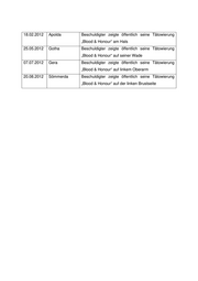 18.02.2012 Apolda Beschuldigter zeigte öffentlich seine Tätowierung „Blood & Honour“ am Hals 25.05.2012 Gotha Beschuldigter zeigte öffentlich seine Tätowierung „Blood & Honour“ auf seiner Wade 07.07.2012 Gera Beschuldigter zeigte öffentlich seine Tätowierung „Blood & Honour“ auf linkem Oberarm 20.08.2012 Sömmerda Beschuldigter zeigte öffentlich seine Tätowierung „Blood & Honour“ auf der linken Brustseite