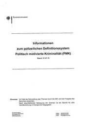 Bundeskriminalamt Informationen zum polizeilichen Definitionssystem Politisch motivierte Kriminalität (PMK) Stand: 01.07.10 Hinweise: Im Falle der Behandlung des Themas durch die IMK wird die Freigabe des Berichtes empfohlen. Nach abschließender Befassung der Gremien ist der Bericht für eine Veröffentlichung in Extrapol.de freigegeben. Bundeskriminalamt Kommission Staatsschutz Telefon: (02225) 89-22249 Geschäftsführung Telefax: (02225) 89-45433 53338 Meckenheim E-Mail: staskst@bka.bund.de