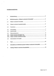 Inhaltsverzeichnis 1 vorbemerkung 2 Deflnitionssystem „Politisch motivierte Kriminalität“ 4 2.1 Politisch motivierte Kriminalität 5 2.2 Politisch motivierte Sewaltkriminalität 6 2.3 Terrorismus 6 2.4 Themenfelder 7 2.4.1 Hasskriminalität 7 2.5 Phänomenbereiche 8 2.5.1 Politisch motivierte Kriminalität -links- 8 2.5.2 Politisch motivierte Kriminalität -rechts- 9 2.5.3 Politisch motivierte Ausländerkriminalität 9 2.6 Extremistische Kriminalität 10 3 Fazit 10 4 Schaubild zum Definitionssystem Politisch motivierte Kriminalität 12 5 Katalog Politisch motivierte Gewaltdelikte 13 Seite 2 von 14