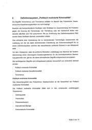 mit ihren jeweiligen Ausprägungen ab. Dabei ist lediglich in der Dimension „Themenfeld“ eine Mehrfachabbildung möglich. Dieses Definitionssystem ermöglicht eine differenzierte Auswertung und Lagedarstellung, die Grundlage für effiziente präventive und repressive Maßnahmen sind. Das „Schaubild zum Definitionssystem Politisch motivierte Kriminalität“ (Nr. 4) verdeutlicht diese Systematik. 2.1 Politisch motivierte Kriminalität Der Politisch motivierten Kriminalität werden Straftaten zugeordnet, wenn in Würdigung der Umstände der Tat und/oder der Einstellung des Täters Anhaltspunkte dafür vorliegen, dass sie - den demokratischen Willensbildungsprozess beeinflussen sollen, der Erreichung oder Verhinderung politischer Ziele dienen oder sich gegen die Realisierung politischer Entscheidungen richten, - sich gegen die freiheitlich demokratische Grundordnung bzw. eines ihrer Wesensmerkmale, den Bestand und die Sicherheit des Bundes oder eines Landes richten oder eine ungesetzliche Beeinträchtigung der Amtsführung von Mitgliedern der Verfassungsorgane des Bundes oder eines Landes zum Ziel haben, - durch Anwendung von Gewalt oder darauf gerichtete Vorbereitungshandlungen auswärtige Belange der Bundesrepublik Deutschland gefährden, - gegen eine Person gerichtet sind, wegen ihrer politischen Einstellung, Nationalität, Volkszugehörigkeit, Rasse, Hautfarbe, Religion, Weltanschauung, Herkunft oder aufgrund ihres äußeren Erscheinungsbildes, ihrer Behinderung, ihrer sexuellen Orientierung oder ihres gesellschaftlichen Status und die Tathandlung damit im Kausalzusammenhang steht, bzw. sich in diesem Zusammenhang gegen eine Institution/Sache oder ein Objekt richtet. Darüber hinaus werden Tatbestände gem. §~ 80-83, 84-86a, 87-91, 94-bOa, 102-104a, 105-108e, bO~-b09h, 129a, 12gb, 234a oder 241a StGB erfasst, weil sie Staatsschutzdelikte sind, selbst wenn im Einzelfall eine politische Motivation nicht festgestellt werden kann. • Erläuterung: Die Bezeichnung Politisch motivierte Kriminalität wurde gewählt, obwohl die darunter aufge führten Delikte in Einzelfällen auch ohne explizite politische Motivation verwirklicht werden können. Seite 5 von 14