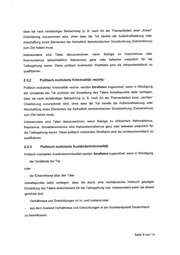dass sie nach verständiger Betrachtung (z. 8. nach Art der Themenfelder) einer „linken“ Orientierung zuzurechnen sind, ohne dass die Tat bereits die Außerkraftsetzung oder Abschaffung eines Elementes der freiheitlich demokratischen Grundordnung (Extremismus) zum Ziel haben muss. Insbesondere sind Taten dazuzurechnen, wenn Bezüge zu Anarchismus oder Kommunismus (einschließlich Marxismus) ganz oder teilweise ursächlich für die Tatbegehung waren. Diese politisch motivierten Straftaten sind als linksextremistisch zu qualifizieren. 2.5.2 Politisch motivierte Kriminalität -rechts- Politisch motivierter Kriminalität -rechts- werden Straftaten zugeordnet, wenn in Würdigung der Umstände der Tat und/oder der Einstellung des Täters Anhaltspunkte dafür vorliegen, dass sie nach verständiger Betrachtung (z. 8. nach Art der Themenfelder) einer „rechten“ Orientierung zuzurechnen sind, ohne dass die Tat bereits die Außerkraftsetzung oder Abschaffung eines Elementes der freiheitlich demokratischen Grundordnung (Extremismus) zum Ziel haben muss. Insbesondere sind Taten dazuzurechnen, wenn Bezüge zu völkischem Nationalismus, Rassismus, Sozialdarwinismus oder Nationalsozialismus ganz oder teilweise ursächlich für die Tatbegehung waren. Diese politisch motivierten Straftaten sind als rechtsextremistisch zu qualifizieren. 2.5.3 Politisch motivierte Ausländerkriminalität Politisch motivierter Ausländerkriminalität werden Straftaten zugeordnet, wenn in Würdigung - der Umstände der Tat oder - der Erkenntnisse über den Täter Anhaltspunkte dafür vorliegen, dass die durch eine nichtdeutsche Herkunft geprägte Einstellung des Täters entscheidend für die Tatbegehung war, insbesondere wenn sie darauf gerichtet sind - Verhältnisse und Entwicklungen im In- und Ausland oder - aus dem Ausland Verhältnisse und Entwicklungen in der Bundesrepublik Deutschland zu beeinflussen. Seite 9 von 14