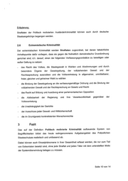 Erläuterung: Straftaten der Politisch motivierten Ausländerkriminalität können auch durch deutsche Staatsangehörige begangen werden. 2.6 Extremistische Kriminalität Der extremistischen Kriminalität werden Straftaten zugeordnet, bei denen tatsächliche Anhaltspunkte dafür vorliegen, dass sie gegen die freiheitlich demokratische Grundordnung gerichtet sind; d.h. darauf, einen der folgenden Verfassungsgrundsätze zu beseitigen oder außer Geltung zu setzen: - das Recht des Volkes, die Staatsgewalt in Wahlen und Abstimmungen und durch besondere Organe der Gesetzgebung, der vollziehenden Gewalt und der Rechtssprechung auszuüben und die Volksvertretung in allgemeiner, unmittelbarer, freier, gleicher und geheimer Wahl zu wählen - die Bindung der Gesetzgebung an die verfassungsmäßige Ordnung und die Bindung der vollziehenden Gewalt und der Rechtsprechung an Gesetz und Recht - das Recht auf Bildung und Ausübung einer parlamentarischen Opposition die Ablösbarkeit der Regierung und ihre Verantwortlichkeit gegenüber der Volksvertretung die Unabhängigkeit der Gerichte - der Ausschluss jeder Gewalt- und Willkürherrschaft die im Grundgesetz konkretisierten Menschenrechte 3 Fazit Das auf der Definition Politisch motivierte Kriminalität aufbauende System von Begrifflichkeiten bildet das heute wahrgenommene Aufgabengebiet des Polizeilichen Staatsschutzes realistisch und umfassend ab. Dabei können auch Einzelphänomene in ihrer Gesamtheit erfasst werden, die nur zum Teil von Extremisten besetzt sind, ohne jede Straftat und jeden Täter mit dem unterstellten Motiv der Systemüberwindung belegen zu müssen. Seite 10 von 14