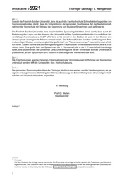 Thüringer Landtag 5. Wahlperiode Drucksache 5/ 5921 27.03.2013 Kleine Anfrage der Abgeordneten Rothe-Beinlich (BÜNDNIS 90/DIE GRÜNEN) und Antwort des Thüringer Ministeriums für Bildung, Wissenschaft und Kultur Sponsoring-Aktivitäten der Thüringer Hochschulen Die Kleine Anfrage 2876 vom 8. Februar 2013 hat folgenden Wortlaut: In öffentlichen Medien (duz 01/2013, S. 28: "Sportlich im Geschäft" und duz 02/2013, S. 34: "Sparsamkeit ist Gebot") wird darüber berichtet, dass die Friedrich-Schiller-Universität Jena seit 20 Jahren das Frauen- fußball-Bundesligateam des Universitätssportvereins Jena e.V. sponsert. Die Unterstützung liege nach den Angaben der Hochschule "... deutlich unter dem Niveau eines Gehaltes eines Bundesligaprofis". Genaue Zahlen wurden nicht benannt. Ich frage die Landesregierung: 1. In welcher jährlichen Höhe haben sich die Thüringer Hochschulen in den letzten fünf Jahren als Sponsor betätigt (bitte gegliedert nach Hochschule und Jahr)? 2. Welche Einzelpersonen, Personengruppen, Organisationen oder Veranstaltungen wurden von den Thüringer Hochschulen in Form von Geldleistungen im Rahmen des Sponsorings und im Rahmen von Spenden in welcher Höhe unterstützt (bitte gegliedert nach Hochschule, Jahr, Höhe der Zuwendung, Empfänger/-in der Zuwendung)? 3. Wie begründen die Hochschulen ihre jeweiligen Sponsoring-Aktivitäten? 4. Welche Gremien bzw. Personen entscheiden an den einzelnen Hochschulen darüber, welche Personen, Organisationen oder Veranstaltungen im Rahmen des Sponsorings unterstützt werden? 5. Welche Auffassung vertritt die Landesregierung zu den Sponsoring-Aktivitäten der einzelnen Hochschu- len? Das Thüringer Ministerium für Bildung, Wissenschaft und Kultur hat die Kleine Anfrage namens der Landesregierung mit Schreiben vom 26. März 2013 wie folgt beantwortet: Zu 1.: Die von den Thüringer Hochschulen in den Jahren 2008 bis 2012 geleisteten Sponsoringbeträge sind in der Anlage dargestellt. Zu 2.: Die Empfänger der Sponsoringleistungen Thüringer Hochschulen sind in der Anlage dargestellt. Druck: Thüringer Landtag, 17. April 2013