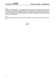 Drucksache 4/ 1275 Thüringer Landtag - 4. Wahlperiode Zu 3.: Gemäß § 16 Thüringer Kinder- und Jugendhilfe-Ausführungsgesetzes (ThürKJHAG) ist der örtliche Träger der öffentlichen Jugendhilfe für die Jugendhilfeplanung und die Erstellung des Jugendförderplans zustän- dig. Durch den örtlichen Jugendhilfeausschuss wird die Rangfolge der zu fördernden Einrichtungen, Diens- te und Veranstaltungen der Jugendarbeit festgelegt. Eine darüber hinausgehende Regelung innerhalb der Richtlinie ist nicht angezeigt. Zu 4.: Der Richtlinienentwurf befindet sich derzeit noch in der Abstimmung mit den kommunalen Spitzenverbän- den. Dr. Zeh Minister 2