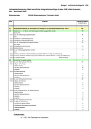 Anlage 1 zur Kleinen Anfrage Nr. 1365 Jahresnachweisung über berufliche Integrationserfolge in der JSA Ichtershausen; hier: Berichtsjahr 2009 Bildungsträger: GRONE Bildungszentren Thüringen GmbH Ziffer Kriterium männliche Jugend- strafgefangene 1 2 3 3.1 Anzahl der Entlassenen im Berichtsjahr (aus Anlage Nr. 64 Vollzugsgeschäftsordnung -VGO-): 145 3.2 Anzahl von 3.1 mit denen eine Nachsorgevereinbarung getroffen wurde: 93 davon sind 3.2.1 nach der Entlassung umgesetzt worden: 65 davon 3.2.1.1 innerhalb des 1. bis 3. Nachsorgemonats: 53 3.2.1.2 innerhalb des 4. bis 6. Nachsorgemonats: 12 3.2.2 nach der Entlassung nicht umgesetzt worden: 23 davon wegen 3.2.2.1 Kontaktabbruch durch den Klienten 16 3.2.2.2 Wiederinhaftierung 7 3.2.3 bis zur Entlassung aufgehoben worden: 5 davon 3.2.3.1 auf Wunsch der Klienten im Vorfeld der Entlassung (zeitlicher Richtwert: >14 Tage vor der Entlassung): 1 3.2.3.2 auf Wunsch der Klienten am Entlassungstag oder unmittelbar davor (zeitlicher Richtwert:< 14 Tage vor der Entlassung): 3 3.2.3.3 aus sonstigen Gründen: (Siehe Erläuterung) 1 3.3 Beruflicher Integrationsstatus 3.3.1 der unter 3.2.1 erfassten Klienten 65 3.3.1.1 zu Beginn der Nachsorge a) Arbeitsverhältnis: 6 b) berufliche Bildungsmaßnahme: 56 c) arbeitslos: 3 3.3.1.2 am Ende der Nachsorge a) Arbeitsverhältnis: 2 b) berufliche Bildungsmaßnahme: 47 c) arbeitslos: 16 3.3.2 der unter 3.2.2 erfassten Klienten 23 3.3.2.1 zu Beginn der Nachsorge a) Arbeitsverhältnis: 2 b) berufliche Bildungsmaßnahme: 14 c) arbeitslos: 7 d) ungeklärt: 0 3.3.2.2 vor dem Kontaktabbruch bzw. der Wiederinhaftierung a) Arbeitsverhältnis: 0 b) berufliche Bildungsmaßnahme: 9 c) arbeitslos: 4 d) ungeklärt: 10 3.3.3 der unter 3.2.3 erfassten Klienten 5 3.3.3.1 zum Zeitpunkt der Entlassung a) (angebahntes) Arbeitsverhältnis: 0 b) (angebahnte) berufliche Bildungsmaßnahme: 2 c) (potentiell) arbeitslos: 3 d) ungeklärt: 0 Erläuterungen: zu 3.2.3.3: Der Gefangene ist verstorben.