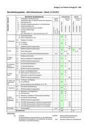 Anlage 2 zur Kleinen Anfrage Nr. 1365 Berufsbildungsatlas - JSA Ichtershausen - Stand 21.03.2011 Berufliche Qualifikationen Ichtershausen Weimar Berufsfeld / Branche 1 Facharbeiter-/Gesellenabschluss geprüft Maßnahme- Maßnahme- 2 Teilqualifizierungen mit staatlich anerkanntem Abschluss druch dauer* dauer* vorgehaltene Plätze vorgehaltene Plätze 2.1 IHK Fachkraft (FK) 2.2 IHK/HWK Qualifikationsbausteine zum Berufseinstieg 2.3 Zertifikatslehrgänge (ZL) (in Monaten) (in Stunden) (in Monaten) (in Stunden) IHK Südthüringen 2.4 Qualifizierungsbausteine gem. BAVBVO Bildungsträger 2.5 sonstige Zertifizierungen HWK Erfurt sonstige 3 Sonstige (ggf. Trägerzertifikat -TZ- / Teilnahmebescheinigung -TB-) 1 a) Hochbaufacharbeiter x 24 15 b) Maurer (aufbauend auf 1a)) x 12 2.2 Praktiker für Hochbau x 6 1. Bautechnik 2.3 a) ZL Ausbau x 6 15 b) ZL Lehmbau x 6 2.4 BAVBVO-Qualifizierungsbausteine x 140 2.4 BAVBVO-Qualifizierungsbausteine x ind. ind. 12 12 2. EDV 2.5 ECDL-Führerschein x 6-12 6-12 3 Grundkurs innerhalb der Berufsbildungsmaßnahme keine alle ind. 1 Gerätezusammensetzer x 18 3. Elektro- 2.2 Elektromontagekraft für Gebäudetechnik x 15 6 technik 2.4 BAVBVO-Qualifizierungsbausteine x ind. 2.2 Servicekraft Küchenbereich x 6 4. Ernährung, Genuss, 2.3 ZL Gesunde Ernährung x 15 6 Gastgewerbe 2.4 BAVBVO-Qualifizierungsbausteine x ind. 1 a) Bauten- und Objektbeschichter x 24 b) Maler/Lackierer (aufbauend auf 1a) x 12 5. Farbe / 15 Raum 2.2 Beschichter von Beschichtungsträgern x 6 2.4 BAVBVO-Qualifizierungsbausteine x 140 2.3 a) ZL Pflaster- und Wegebau x 6 6. Garten- und Landschafts- b) ZL Grünflächen x 15 6 bau 3 Berufsvorbereitung (ohne BAVBVO/ mit TZ, TB) x 3-11 2.2 Servicekraft Holzbearbeitung x 6 7. Holztechnik 15 2.4 BAVBVO-Qualifizierungsbausteine x 3-11 1 a) Maschinen- und Anlagenführer x 15 24 b) Fahrradmonteur x 15 24 2.2 a) Bearbeiter im Metallbau mit Schweißgrundausbildung x 6 8. Metall- b) Servicekraft Fahrradmontage x 6 technik und Anlagenbau 2.4 BAVBVO-Qualifizierungsbausteine x 3-11 15 2.5 a) DVS-EWF Basisqualifikation Metall-Schutzgasschweißen x 100 b) DVS-EWF Basisqualifikation Elektrodenhandschweißen x 100 c) DVS-EWS Basisqualifikation Wolfram-inert-Schweißen x 100 9. Sonstige 3 Kreativangebote keine 16 Gesamtanzahl: 178 12 Erläuterungen: ind. individuell BAVBVO Berufsausbildungsvorbereitungs- * die Maßnahmedauer unterscheidet sich von der tatsächlichen bescheinigungsverordnung Verweildauer des Gefangenen in der Maßnahme; die optimale DVS Deutscher Verband für Schweißtechnik Verweildauer ist die Maßnahmedauer