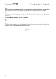 Drucksache 4/ 1822 Thüringer Landtag - 4. Wahlperiode Zu 2.: Die Landesregierung verurteilt die Pläne zur Errichtung dieses so genannten "Ehrenmals", da es in diesem Falle nicht um die Erinnerung geht, sondern um politische Instrumentalisierung durch Extremisten. Zu 3.: Im Rahmen geltenden Rechts steht es jedem frei, nach Belieben über die Nutzung seines Eigentums zu bestimmen. Im Übrigen wird auf die Antwort zu Frage 5 verwiesen. Zu 4.: nein Zu 5.: Die Landesregierung erwartet von den zuständigen Behörden, dass sie alle rechtlichen Möglichkeiten aus- schöpfen, um die Errichtung des Ehrenmals zu verhindern. Dr. Gasser Minister 2