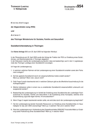 THÜRINGERLandtag Thüringer LANDTAG - 4. Wahlperiode Drucksache 4/ 954 4. Wahlperiode 13.06.2005 Kleine Anfrage der Abgeordneten Jung (PDS) und Antwort des Thüringer Ministeriums für Soziales, Familie und Gesundheit Sozialberichterstattung in Thüringen Die Kleine Anfrage 312 vom 25. April 2005 hat folgenden Wortlaut: In der Plenarsitzung am 22. April 2005 wurde der Antrag der Fraktion der PDS zur Erstellung eines Sozial-, Armuts- und Reichtumsberichts in Thüringen abgelehnt. In der Diskussion machte die Landesregierung deutlich, dass sie beabsichtigt, auch in der 4. Legislaturpe- riode des Thüringer Landtags einen Sozialbericht vorzulegen. Ich frage die Landesregierung: 1. In welchem zeitlichen Rahmen will die Landesregierung einen Sozialbericht erstellen sowie dem Parla- ment vorlegen? 2. Soll der geplante Sozialbericht durch ein wissenschaftliches Institut erstellt werden? Wenn ja, welches? Wenn nein, warum nicht? 3. Falls Frage 2 positiv beantwortet wird: in welchem Zeitraum gibt es die öffentliche Ausschreibung für die Auftragsvergabe? 4. Welche Indikatoren sollen in einem neu zu erstellenden Sozialbericht wissenschaftlich untersucht und ausgewertet werden? 5. Beabsichtigt die Landesregierung im Vorfeld der Erstellung eines Sozialberichts den zuständigen Fach- ausschuss für Soziales, Familie und Gesundheit in die Erarbeitung eines Konzeptes, welches einer Ausschreibung zugrunde liegen könnte, mit einzubeziehen? 6. Wenn Frage 5 negativ beantwortet werden sollte, wie wird dies durch die Landesregierung begründet? 7. Hat die Landesregierung bereits finanzielle Ressourcen zur Erstellung eines Sozialberichtes im Haus- haltsplan für das Jahr 2005 veranschlagt? Wenn ja, in welchem Titel und in welcher Höhe? 8. Plant die Landesregierung in Vorbereitung des Doppelhaushaltes 2006/2007 finanzielle Mittel zur Erstel- lung sowie Publizierung eines Sozialberichtes? Wenn ja, in welcher Höhe? Druck: Thüringer Landtag, 22. Juni 2005 1