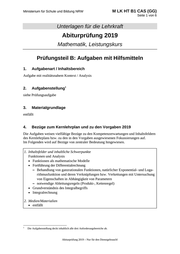 Ministerium für Schule und Bildung NRW M LK HT B1 CAS (GG) Seite 1 von 6 Unterlagen für die Lehrkraft Abiturprüfung 2019 Mathematik, Leistungskurs Prüfungsteil B: Aufgaben mit Hilfsmitteln 1. Aufgabenart / Inhaltsbereich Aufgabe mit realitätsnahem Kontext / Analysis 2. 1 Aufgabenstellung siehe Prüfungsaufgabe 3. Materialgrundlage entfällt 4. Bezüge zum Kernlehrplan und zu den Vorgaben 2019 Die Aufgaben weisen vielfältige Bezüge zu den Kompetenzerwartungen und Inhaltsfeldern des Kernlehrplans bzw. zu den in den Vorgaben ausgewiesenen Fokussierungen auf. Im Folgenden wird auf Bezüge von zentraler Bedeutung hingewiesen. 1. Inhaltsfelder und inhaltliche Schwerpunkte Funktionen und Analysis • Funktionen als mathematische Modelle • Fortführung der Differentialrechnung – Behandlung von ganzrationalen Funktionen, natürlicher Exponential- und Loga- rithmusfunktion und deren Verknüpfungen bzw. Verkettungen mit Untersuchung von Eigenschaften in Abhängigkeit von Parametern – notwendige Ableitungsregeln (Produkt-, Kettenregel) • Grundverständnis des Integralbegriffs • Integralrechnung 2. Medien/Materialien • entfällt 1 Die Aufgabenstellung deckt inhaltlich alle drei Anforderungsbereiche ab. Abiturprüfung 2019 – Nur für den Dienstgebrauch!