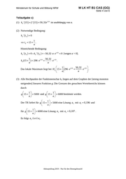 Ministerium für Schule und Bildung NRW M LK HT B1 CAS (GG) Seite 2 von 6 5. Zugelassene Hilfsmittel • CAS (Computer-Algebra-System) • Mathematische Formelsammlung • Wörterbuch zur deutschen Rechtschreibung 6. Modelllösungen Die jeweilige Modelllösung stellt eine mögliche Lösung bzw. Lösungsskizze dar. Der gewählte Lösungsansatz und -weg der Prüflinge muss nicht identisch mit dem der Modelllösung sein. Sachlich richtige Alternativen werden mit entsprechender Punktzahl bewertet (Bewertungsbogen: Zeile „Sachlich richtige Lösungsalternative zur Modelllösung“). Teilaufgabe a) (1) a = 296 . f ( 4 ) = 590 296e b ⋅4 = 590 b ≈ 0,172 . (2) f ( 6 ) ≈ 820,866 . Die Anzahl der Glasfaserhaushalte beträgt ungefähr 820 000 . f (6 ) 880 ≈ 0, 933 . Die Abweichung beträgt ungefähr 6,7 % . (3) Gesucht ist das Maximum der Ableitungsfunktion f ' für 0 ≤ t ≤ 15 . Der Taschenrechner liefert t = 15 . f ' (15 ) ≈ 644, 45 . Die Anzahl der Glasfaserhaushalte wächst im Modell für t = 15 am schnellsten, also am Ende der ersten fünfzehn Jahre mit einer Geschwindigkeit von ca. 640 000 Haus- halten pro Jahr. Abiturprüfung 2019 – Nur für den Dienstgebrauch!