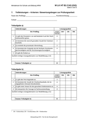 Ministerium für Schule und Bildung NRW M LK HT B1 CAS (GG) Seite 5 von 6 7. Teilleistungen – Kriterien / Bewertungsbogen zur Prüfungsarbeit Name des Prüflings:__________________________________ Kursbezeichnung:_________ Schule: _____________________________________________ Teilaufgabe a) Anforderungen Lösungsqualität Der Prüfling maximal erreichbare Punktzahl 1 (1) gibt den Parameter a an und bestimmt b auf drei Nach- kommastellen genau. 4 2 (2) bestimmt die sinnvoll gerundete Anzahl der Glasfaser- haushalte. 2 3 (2) ermittelt die prozentuale Abweichung. 2 4 (3) bestimmt den Zeitpunkt mit der höchsten Wachstums- geschwindigkeit und die Wachstumsgeschwindigkeit. 4 5 (3) gibt die Einheit an. 1 EK 2 ZK DK Sachlich richtige Lösungsalternative zur Modelllösung: (13) …………………………………………………………………… …………………………………………………………………… Summe Teilaufgabe a) 13 Teilaufgabe b) Anforderungen Lösungsqualität Der Prüfling maximal erreichbare Punktzahl 1 (1) gibt den Wert begründet an. 3 2 (2) bestimmt die Anzahl der Glasfaserhaushalte, die im angegebenen Zeitraum hinzukommen. 4 3 (3) gibt einen Ansatz für den gesuchten Funktionsterm an. 4 4 (4) interpretiert die Aussage im Sachzusammenhang. 4 Sachlich richtige Lösungsalternative zur Modelllösung: (15) …………………………………………………………………… …………………………………………………………………… Summe Teilaufgabe b) 2 15 EK = Erstkorrektur; ZK = Zweitkorrektur; DK = Drittkorrektur Abiturprüfung 2019 – Nur für den Dienstgebrauch! EK ZK DK